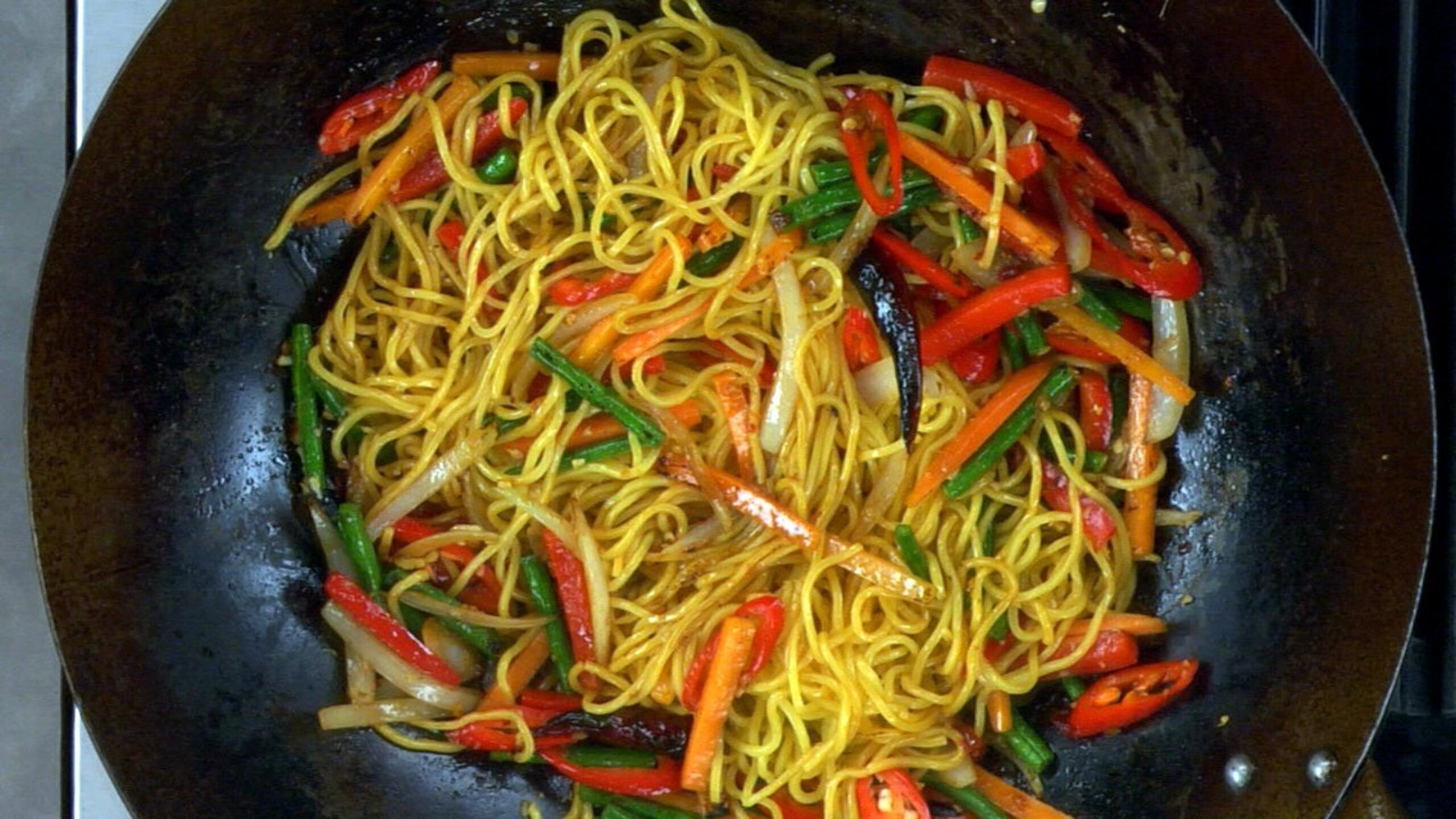 First, stir-fry the dried chilies for a few seconds then add the onions — carrots — green beans — Thai chilies and red peppers — followed by the ginger and garlic. Add the noodles and toss to combine and heat through, then add the sauce. Add the green onions, sesame seeds and/or peanuts. Toss again. Feel free to add a touch more oil during the stir-frying process, if needed. Serve immediately.
