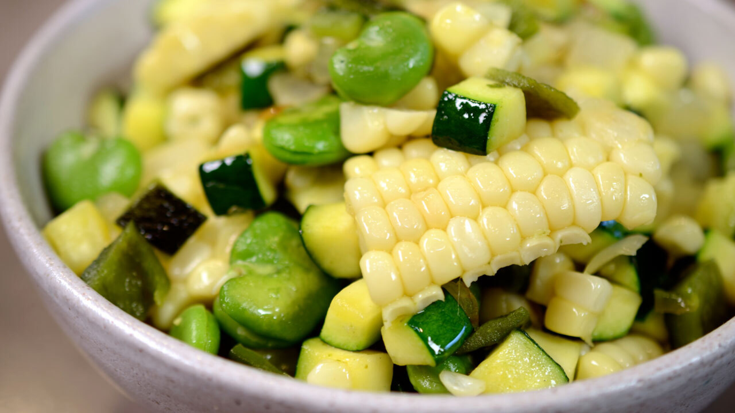To prepare the vegetables, first start with the corn. The easiest way to prepare the corn is to microwave it. With the corn still in the husk, microwave it for about 8 minutes. Once done, remove from the microwave and let sit for a few minutes to cool off. Alternatively, the corn can be cleaned first and then boiled on the stove top.