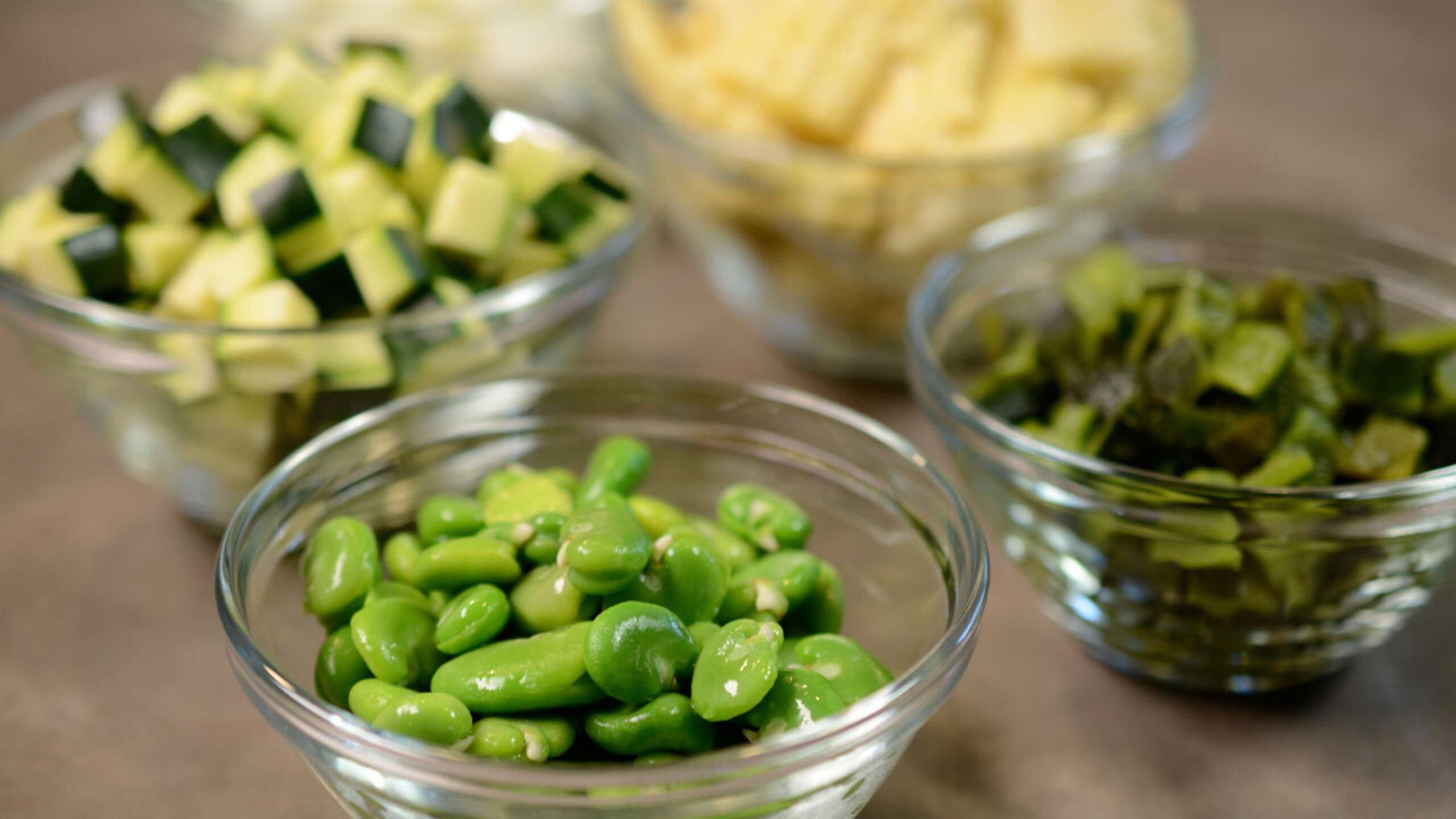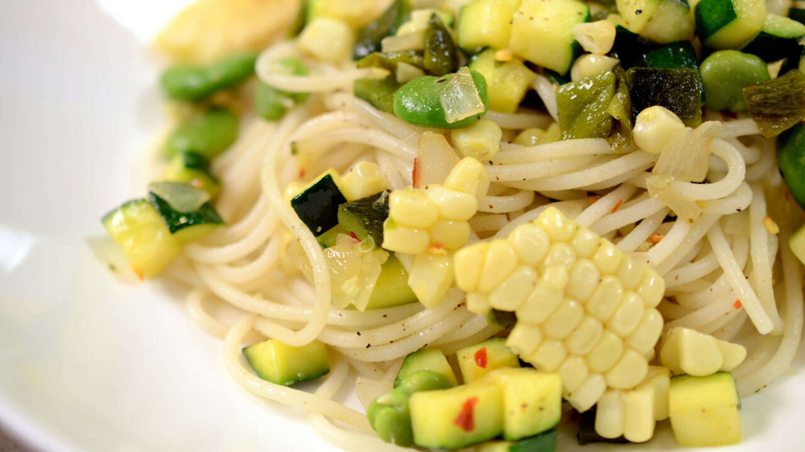 To cook the vegetables, start by sautéing the onion. Use a fairly large frying pan for this, as you do not want to overcrowd the pan. Set the heat to medium. Add the oil, followed by the onions and a generous pinch of salt. Once the onions have become translucent and are just starting to turn brown, add the zucchini. Let cook for a few minutes. Once the zucchini has begun to cook and soften slightly, add the remaining vegetables and let cook for a few minutes to heat through. Be gentle when stirring the vegetables, as you do not want to break them up too much.