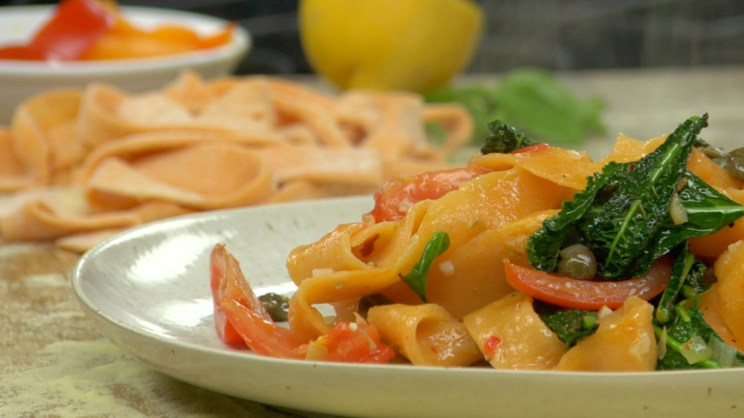 - 2 cups fresh pappardelle noodles - flavored/colored with red pepper powder