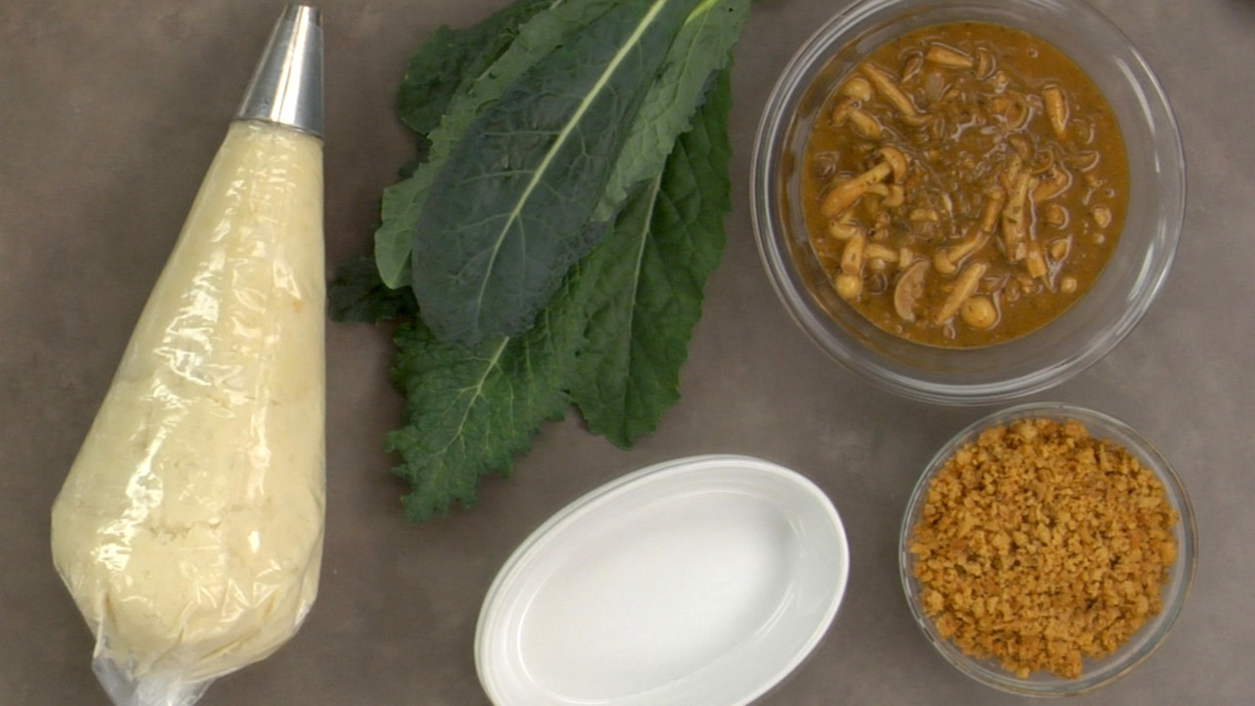 Using a large casserole dish or individual dishes, pour in the mushroom seitan gravy evenly into each vessel. For the Garlic Mashed Potatoes layer, it’s best to use a pastry bag to pipe the potatoes onto the gravy. Alternatively, you can spoon on and spread evenly.
