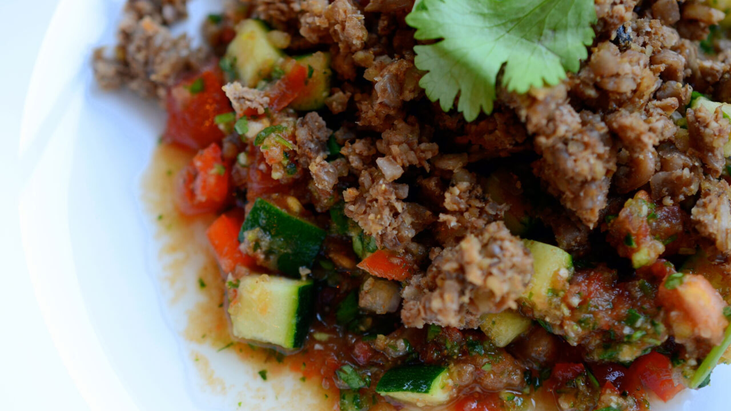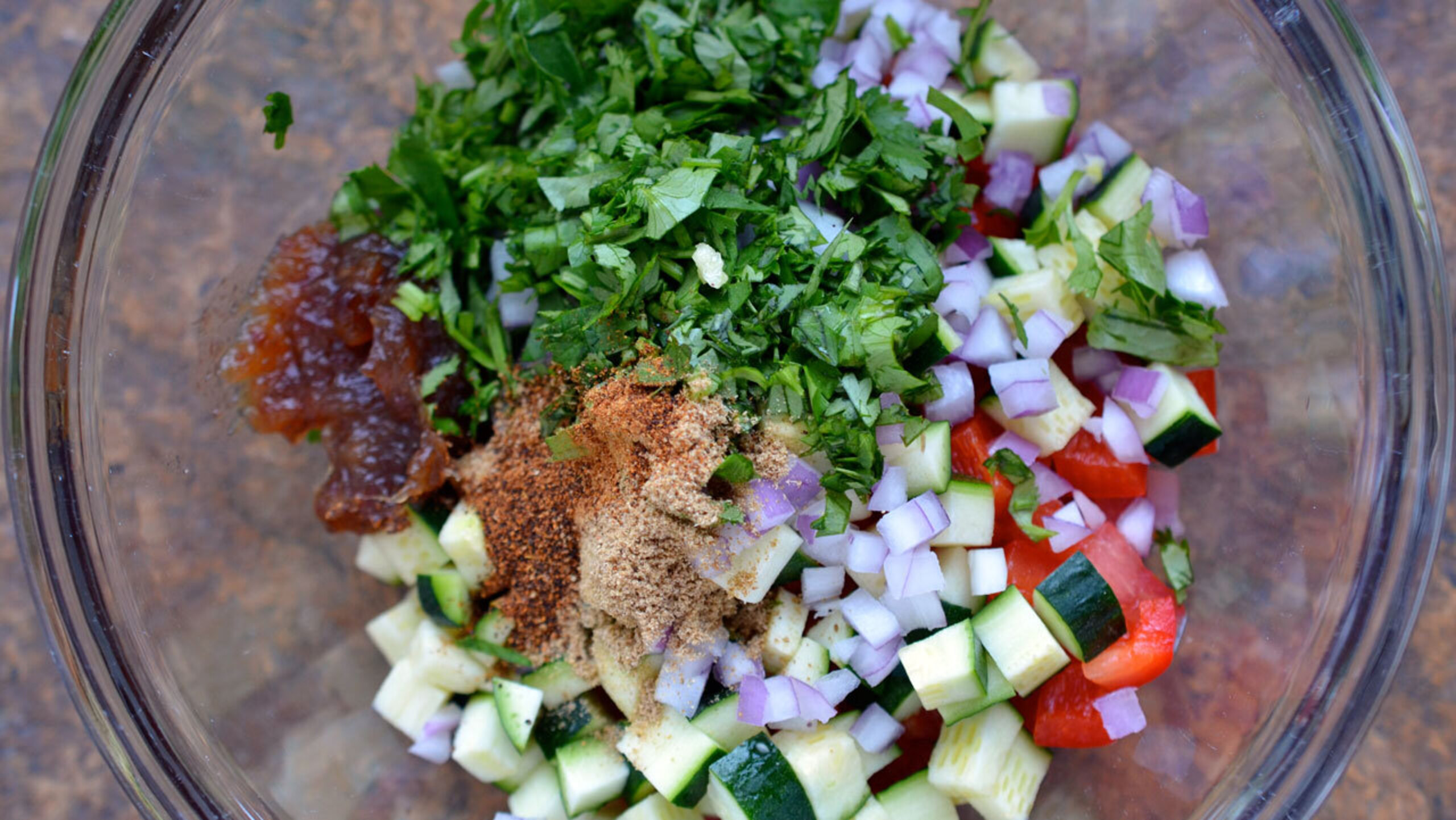 To prepare the salsa, first dice the onion, zucchini, red pepper and tomato and place into a bowl. Roughly chop the cilantro and mince the garlic and add to the bowl.
