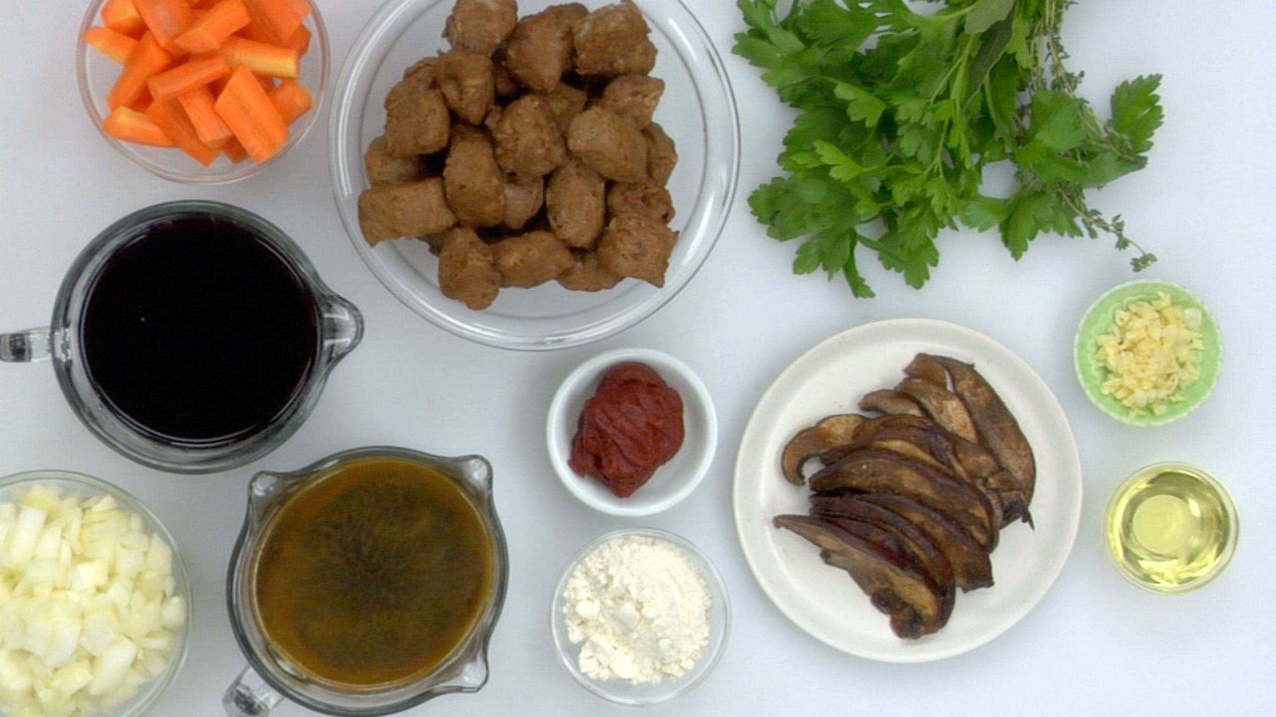 To make the Beefless Bourguignon, first gather and prepare your mise en place.