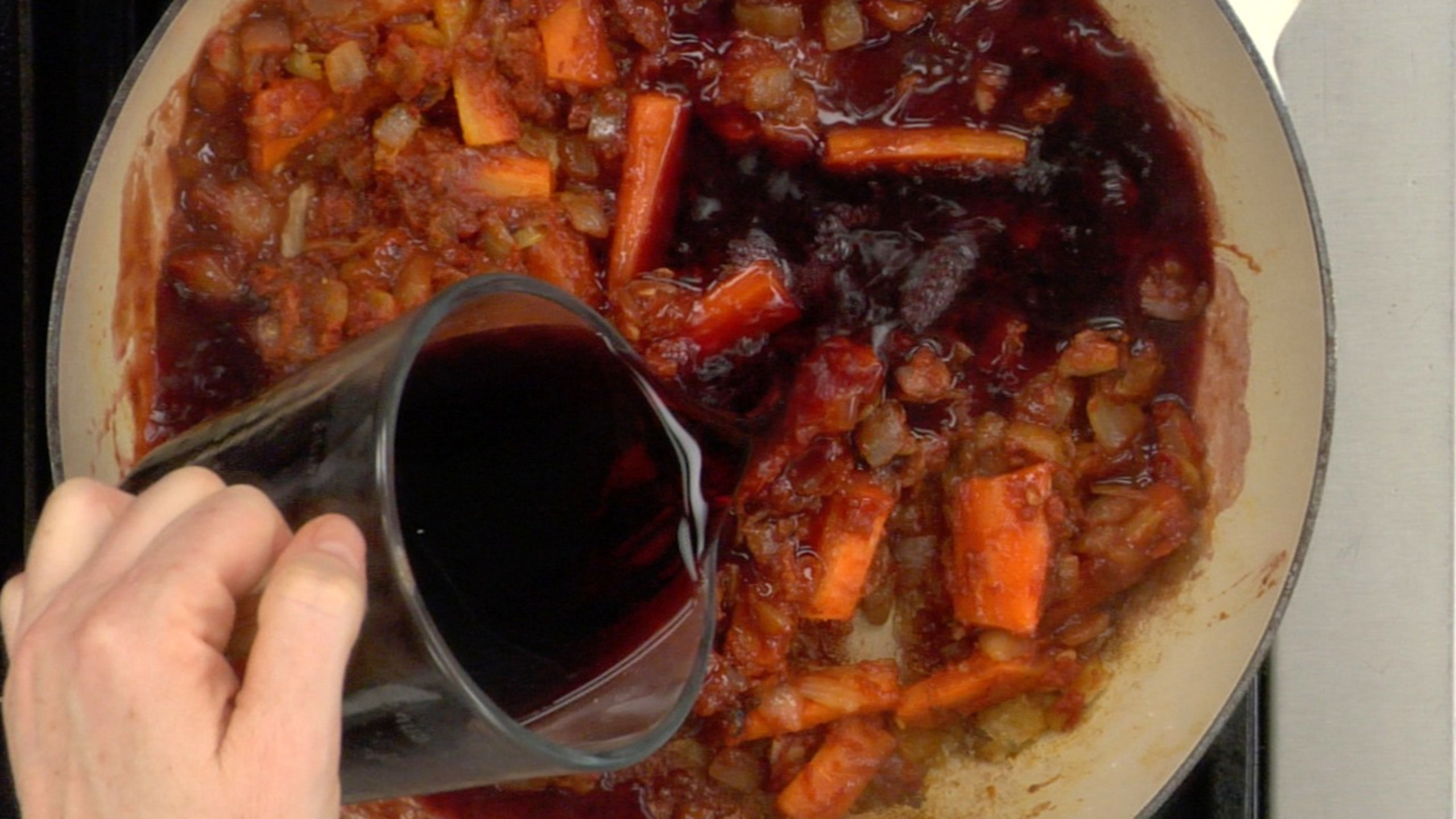 Once the carrots have cooked slight, add the flour and stir to coat the ingredients in the flour. Next add the tomato paste and cook for another minute or so. Next, deglaze the pan with 1/2 cup of the red wine. Add about another cup or so of the red wine and about a cup or so of the dark vegetable stock. Stir to combine the ingredients and bring back up to a simmer. The exact amount of liquid added will ultimately depend on how much flour was used. Basically you want to add equal amounts of red wine and dark stock, until you reach a nice sauce-like consistency.