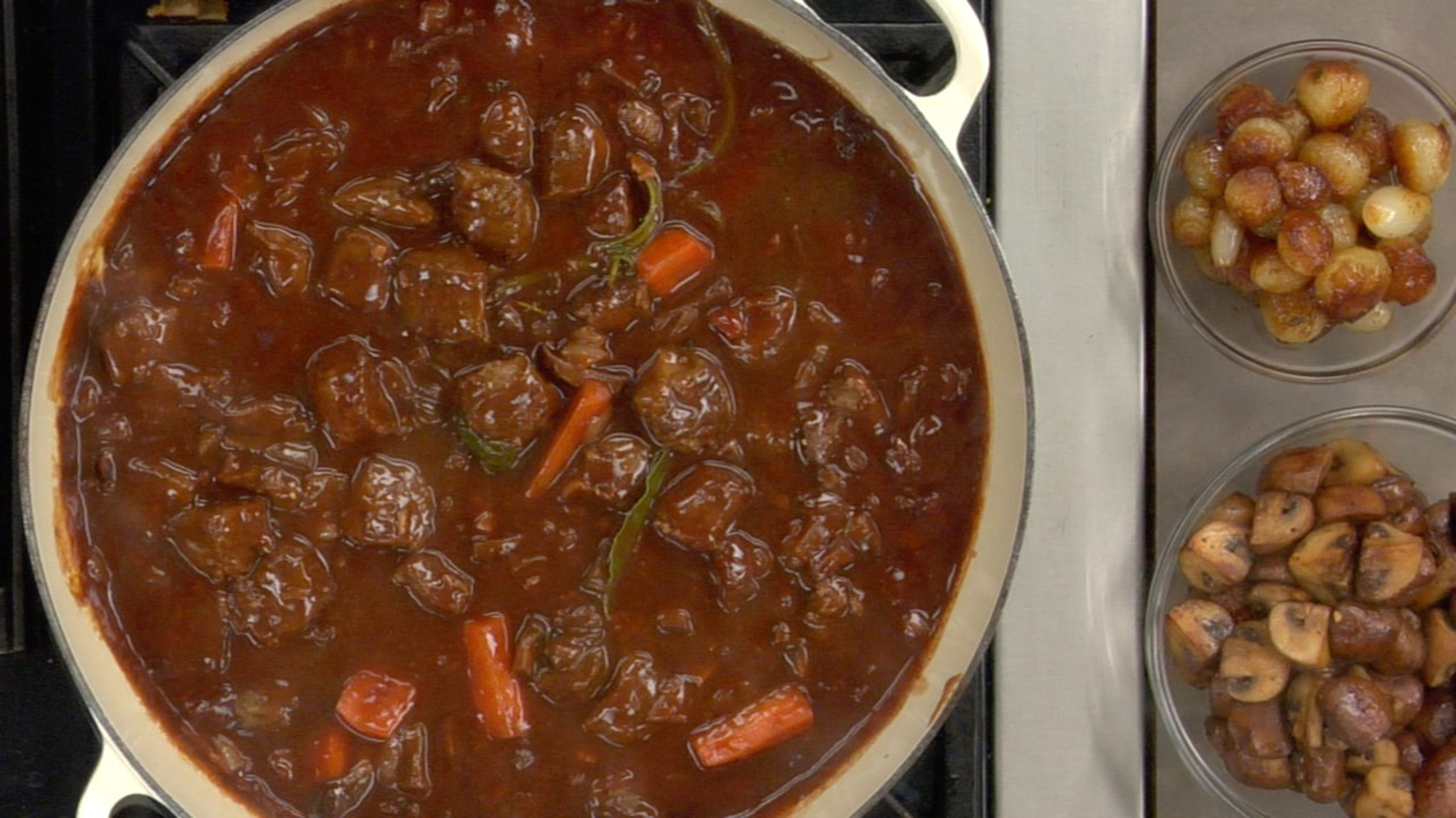 Lastly, remove the bouquet garni and add the Sautéed Mushrooms and Braised Onions and gently fold them into the stew. Once everything has fully heated through, taste one last time before seasoning before serving.