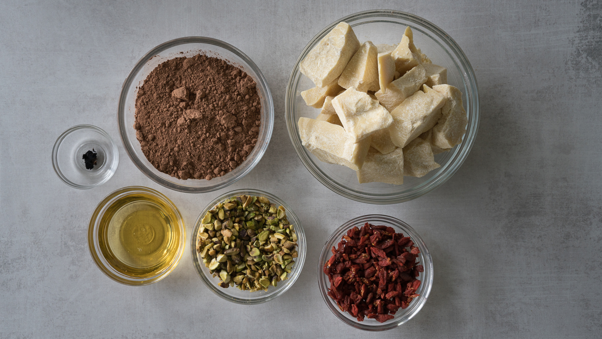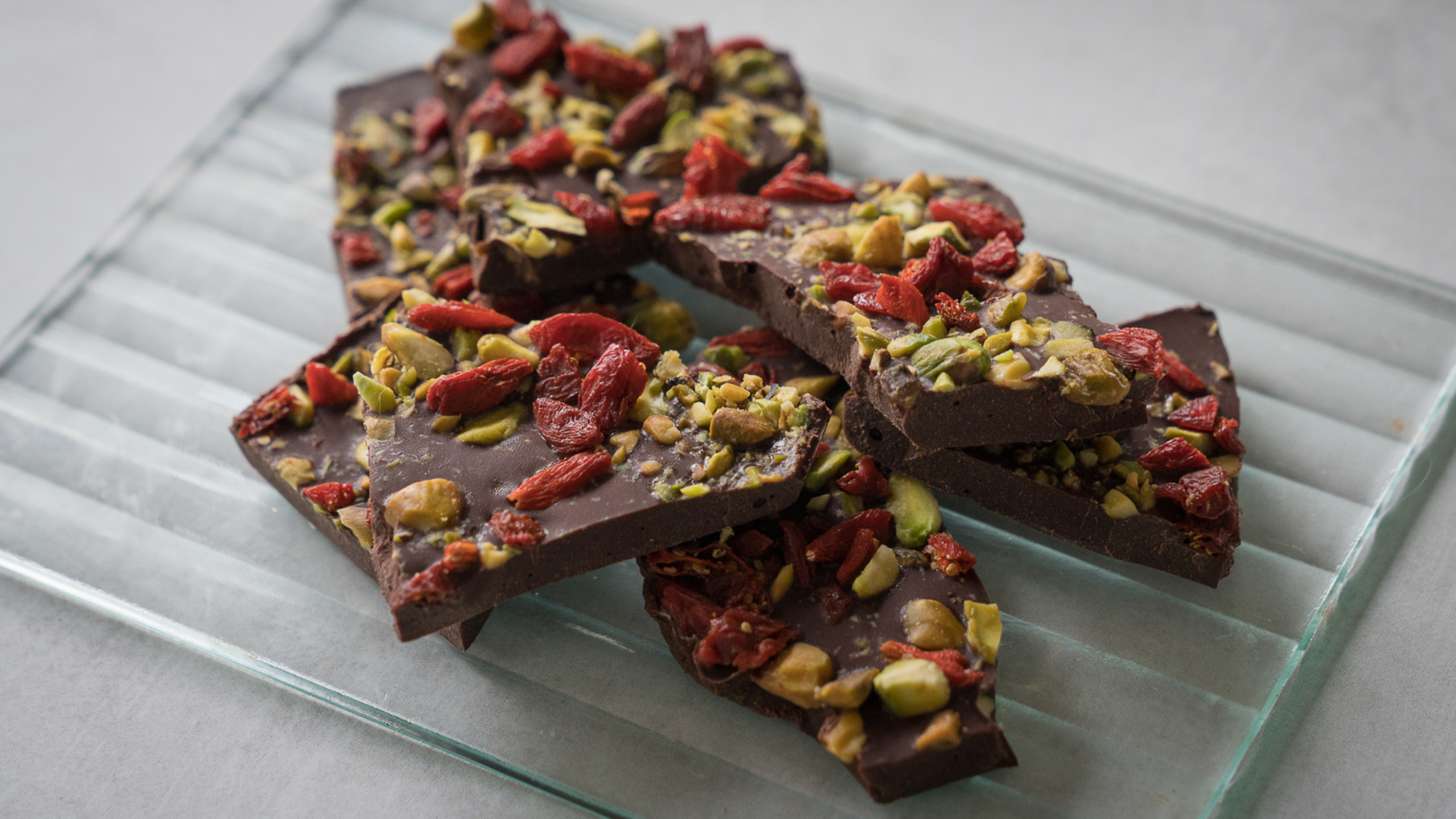 Pour the mixture into a shallow pan, just coating the bottom. Sprinkle the goji berries and pistachios over the top, then place in the freezer to set.