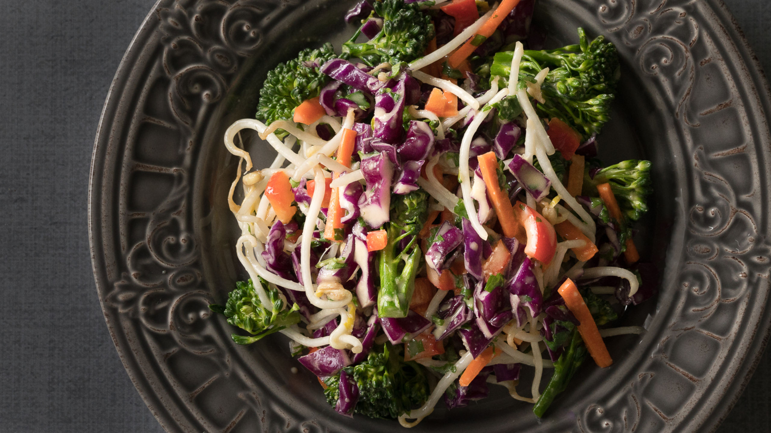 In large bowl, toss all of the vegetables together with the chopped fresh herbs. After a quick toss, remove a small amount of the bean sprouts and herbs and set aside for garnish.
