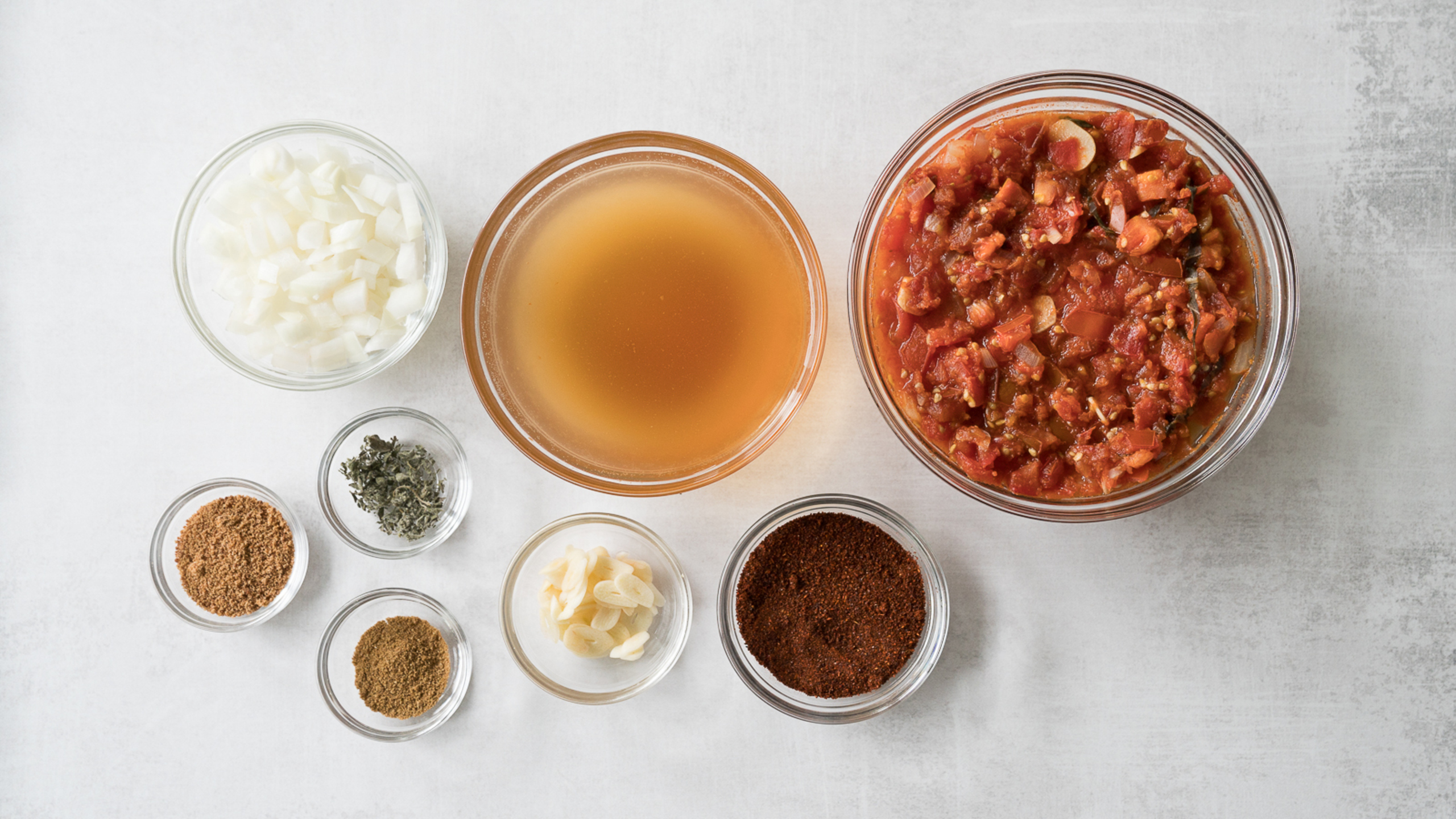 In a sauce pan over medium–high heat, dry sauté the onion for 2 to 3 minutes until softened and beginning to brown. If the mixture is too dry or sticking, add a spoonful of water or stock to release the onions from the pan. Add the garlic and cook for an additional minute, or until fragrant. Next, add the chile powder, cumin and Mexican oregano and stir, lightly to toast the spices.