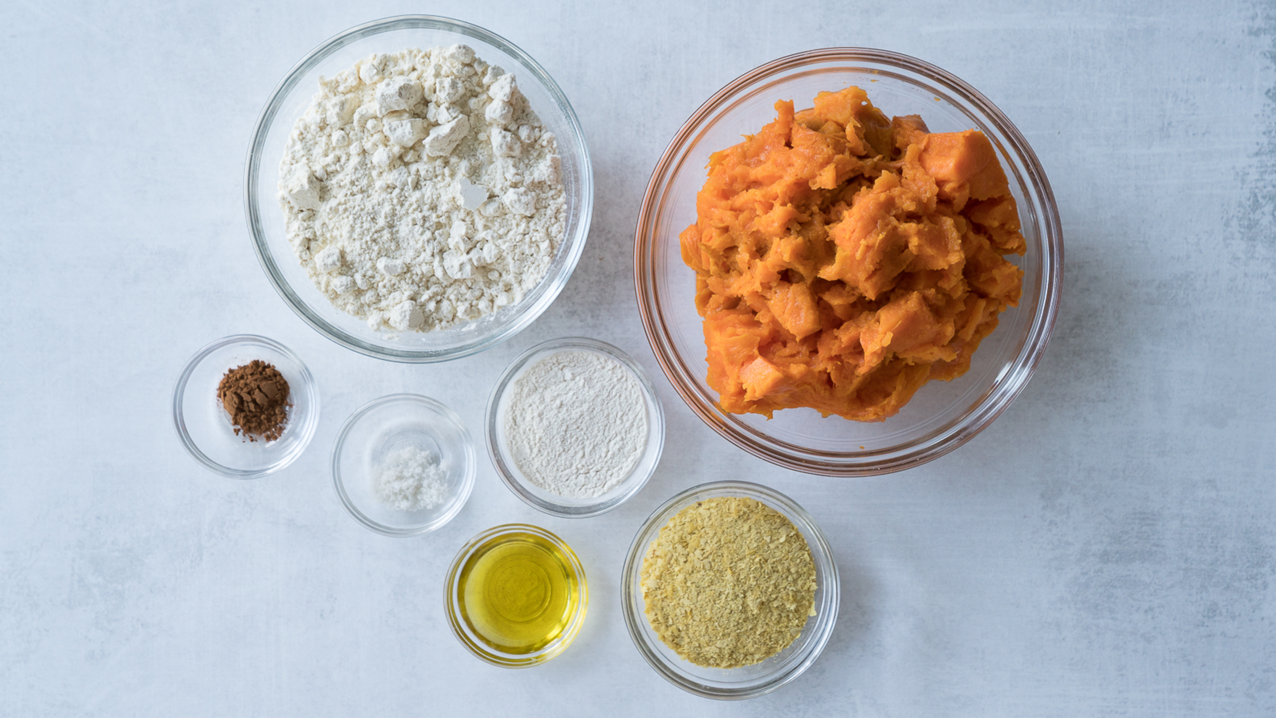 First, dry bake the sweet potatoes to avoid steaming. You need them to dry out a bit before using. Once baked, cool and remove the skin.