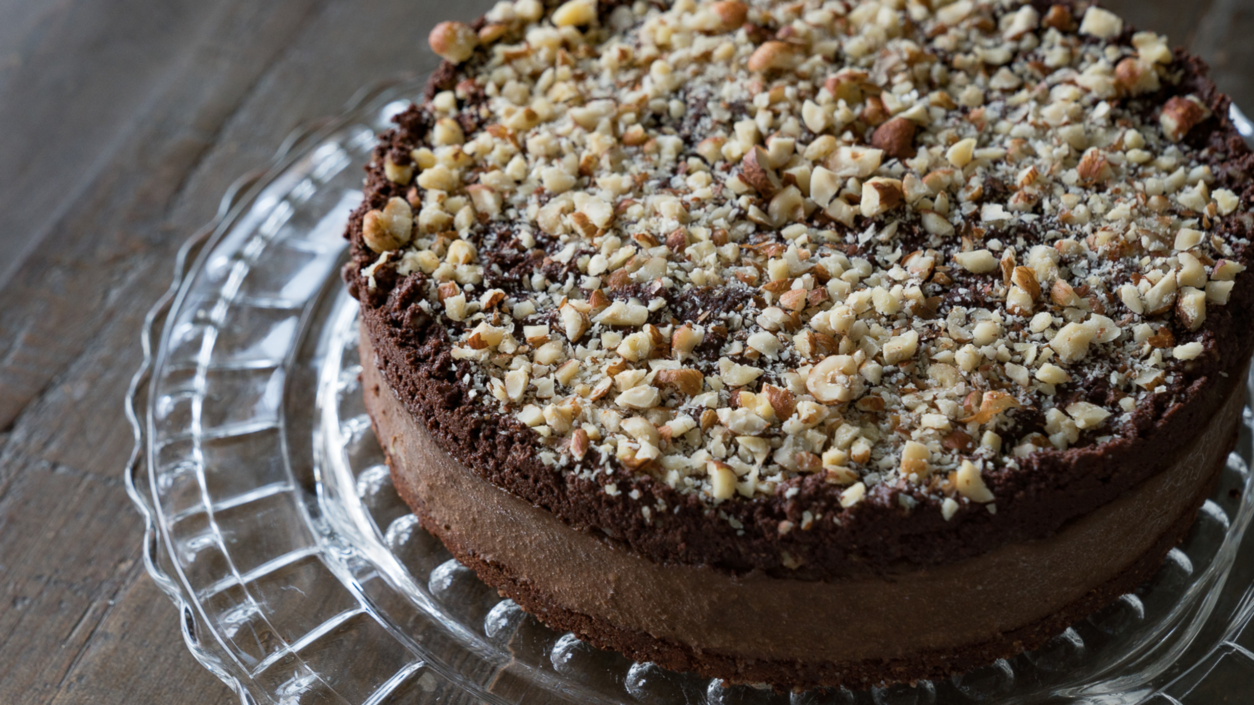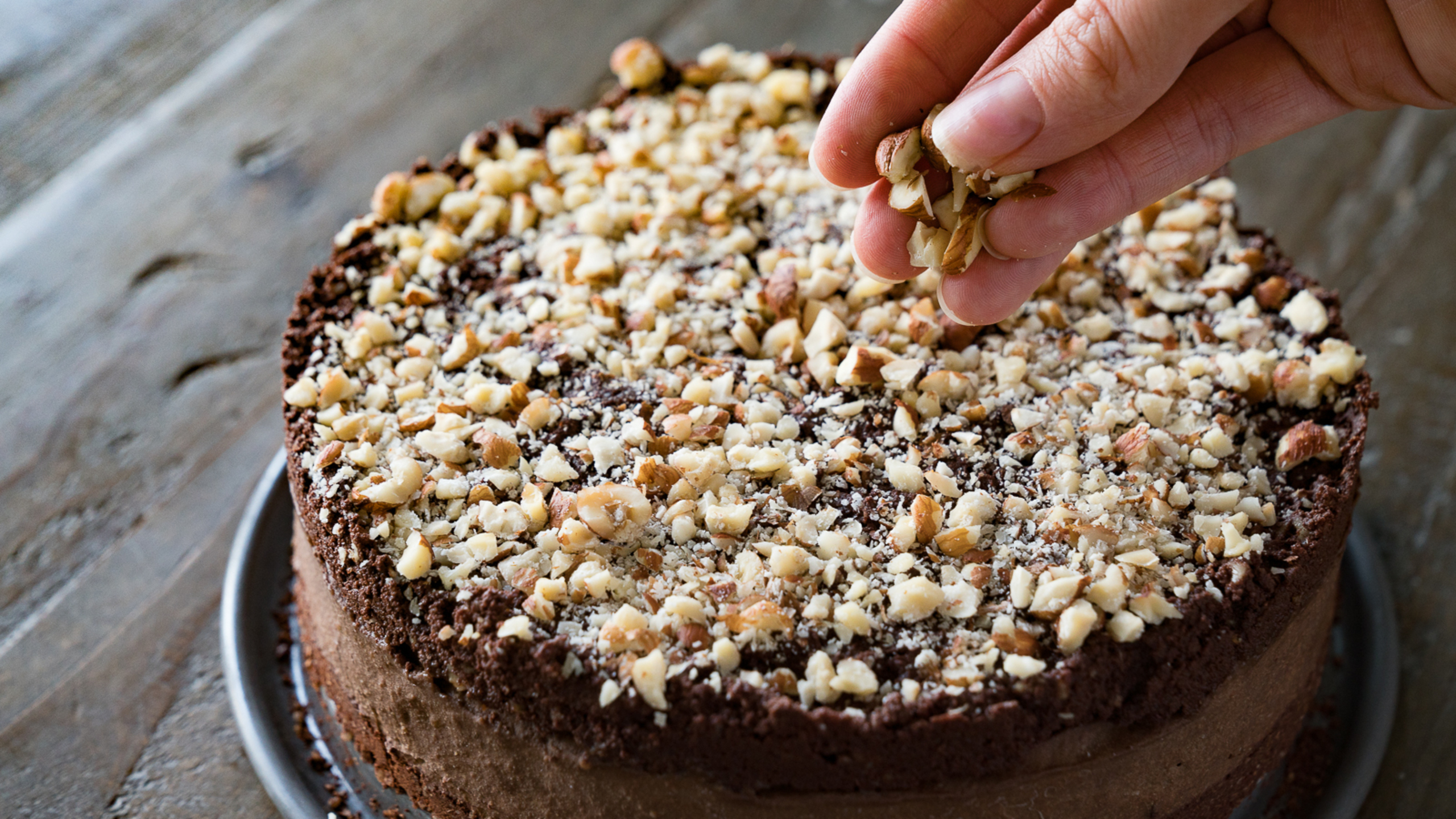 To finish, evenly spread the the ganache over the set filling and top with the remaining nuts.