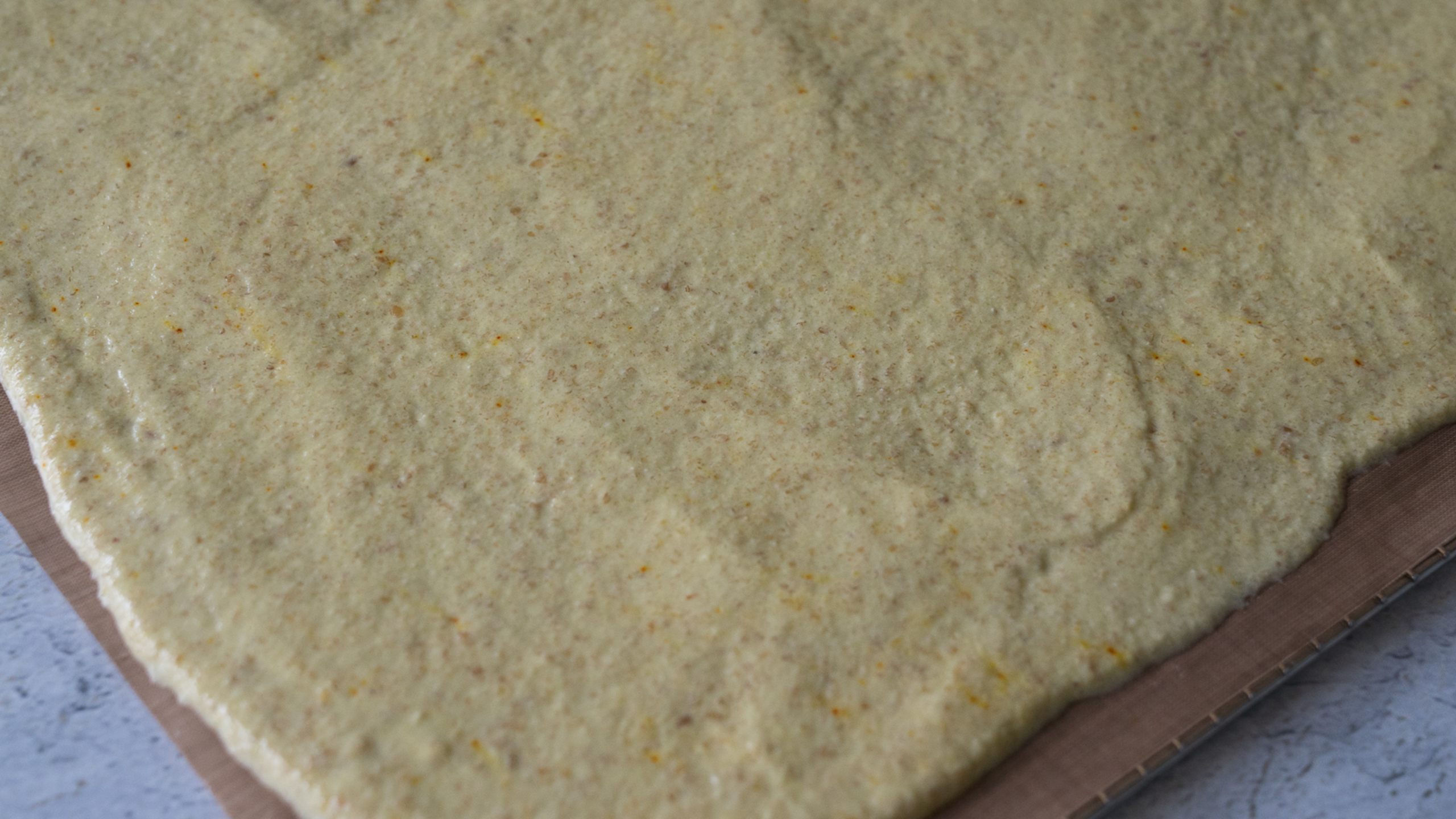 On teflex sheets, spread mixture in a thin layer, just under 1/4–inch thick, and place in the dehydrator at 110°F (45°C) for 4 to 6 hours.