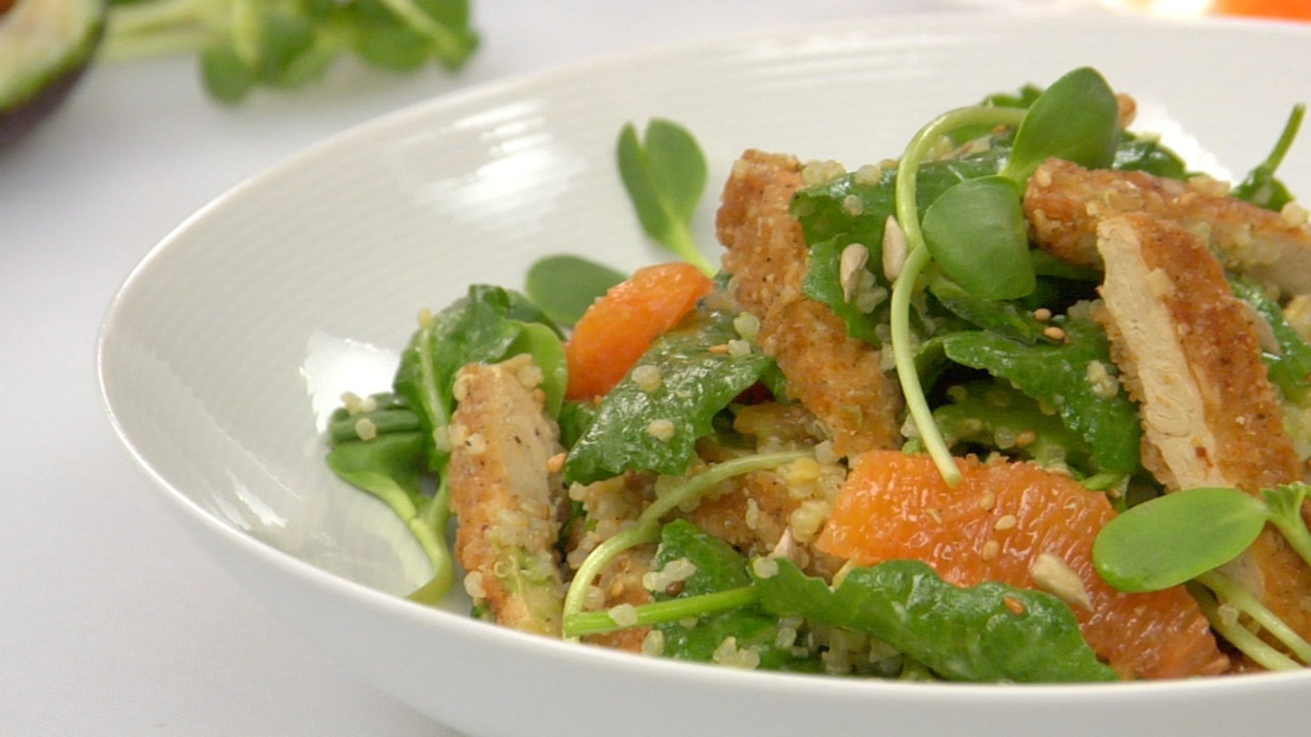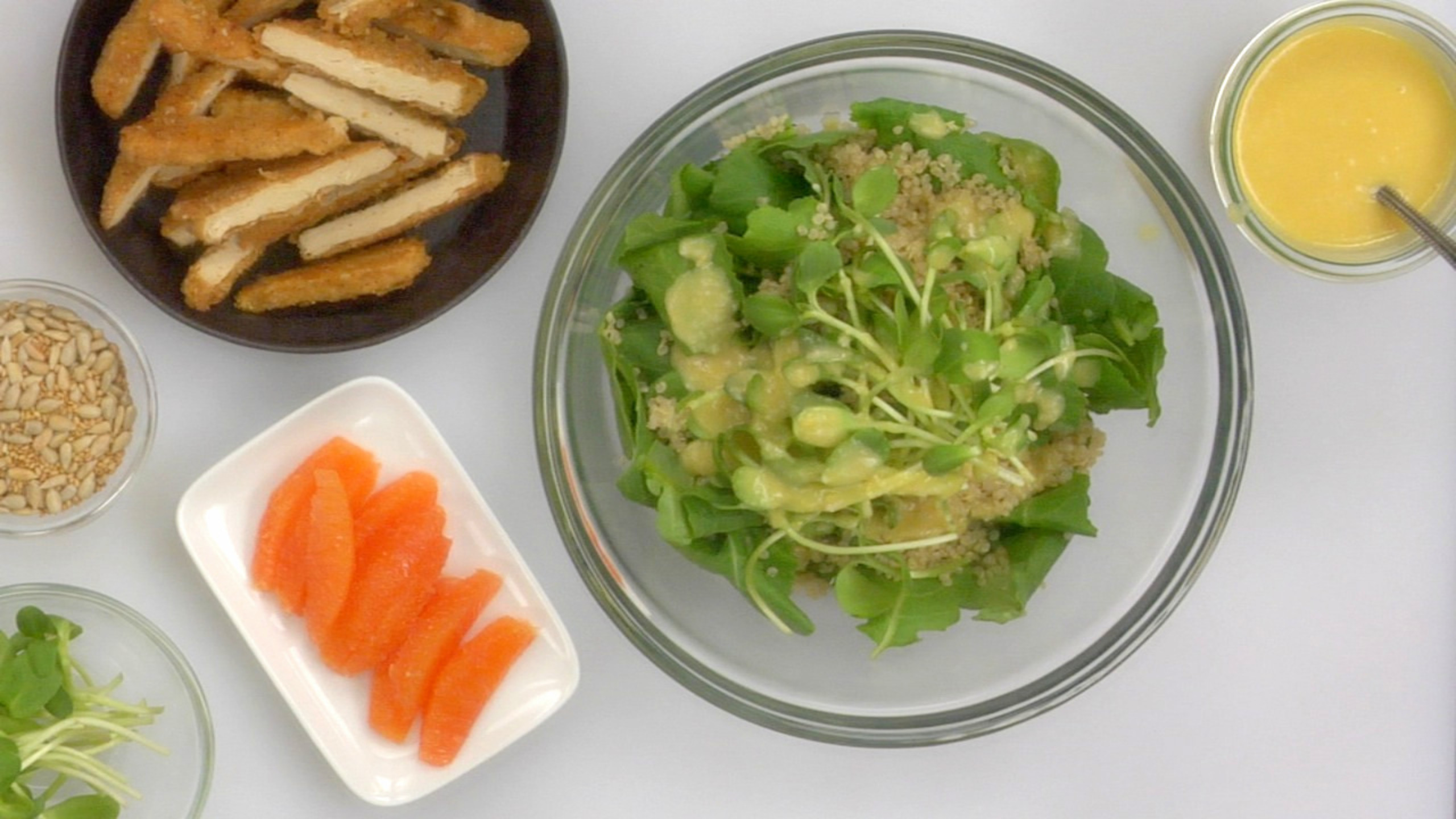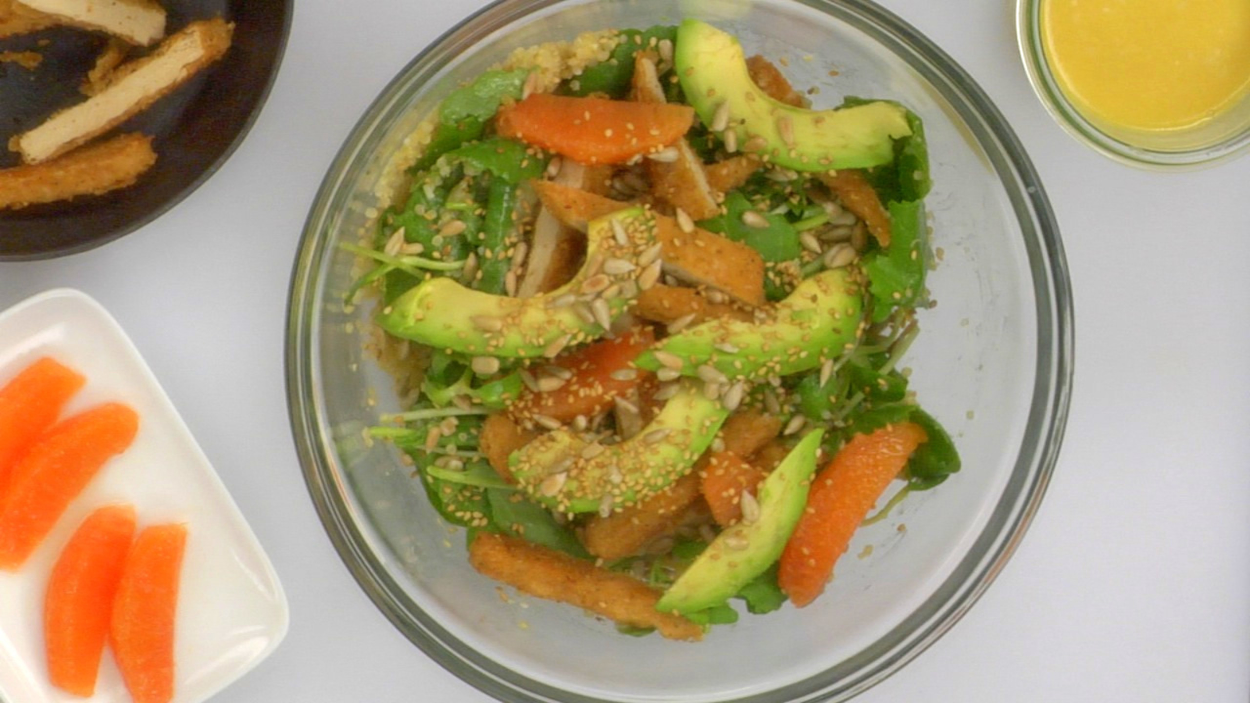 Once greens are lightly tossed, gently add the Chick’n, orange segments and sliced avocado, adding more dressing if needed, to coat the Tenders.