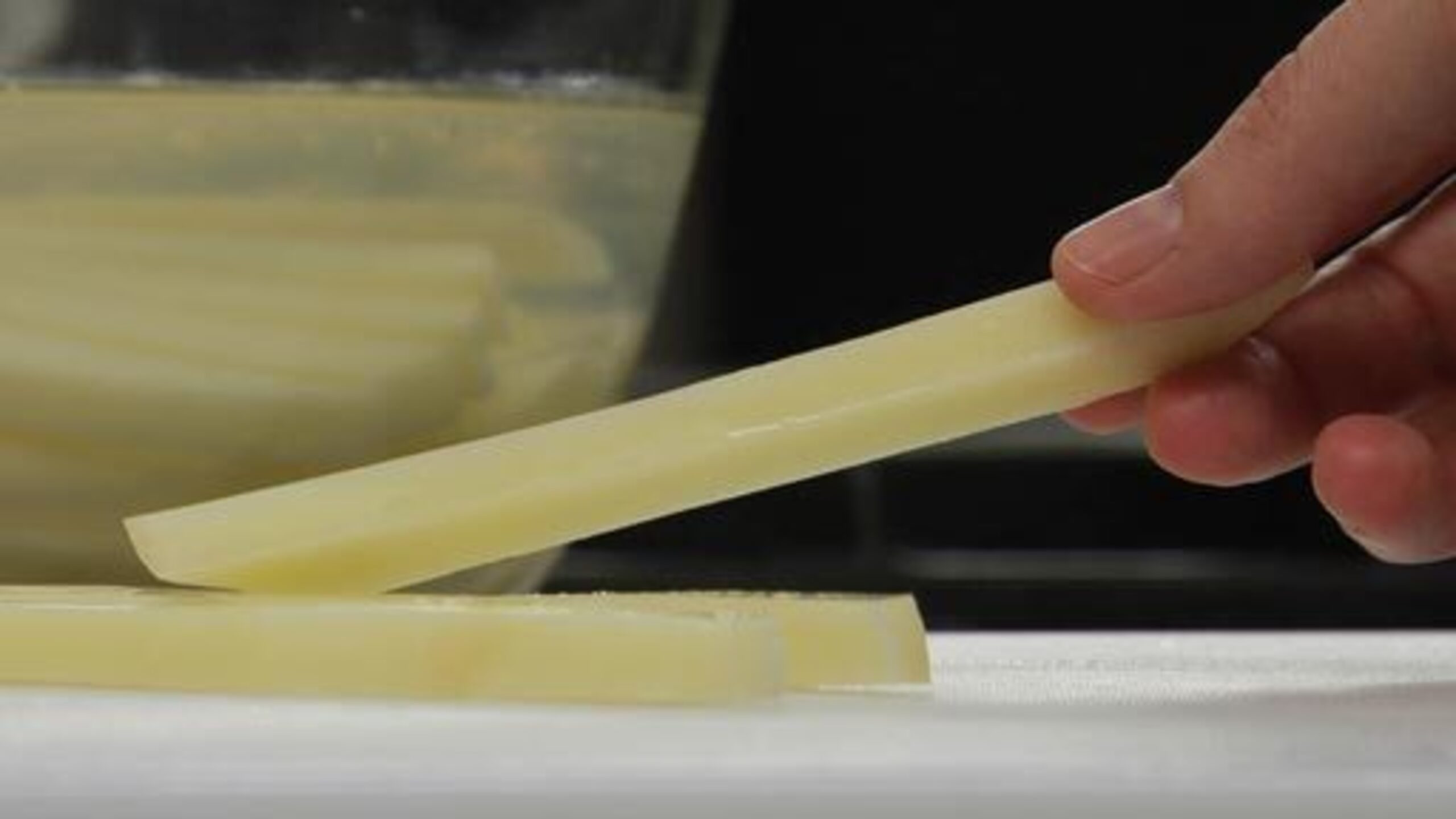 First, peel the potatoes, if desired, and store in cold water. Before cutting each potato, dry it and then cut a bit off one side to prevent it from slipping. Cut the potato into strips about 3/8" -inch by 3/8" -inch wide. The potatoes can be cut any size you like. Just make sure they’re evenly cut so they cook at the same rate. You can also use a mandoline to cut the potatoes.