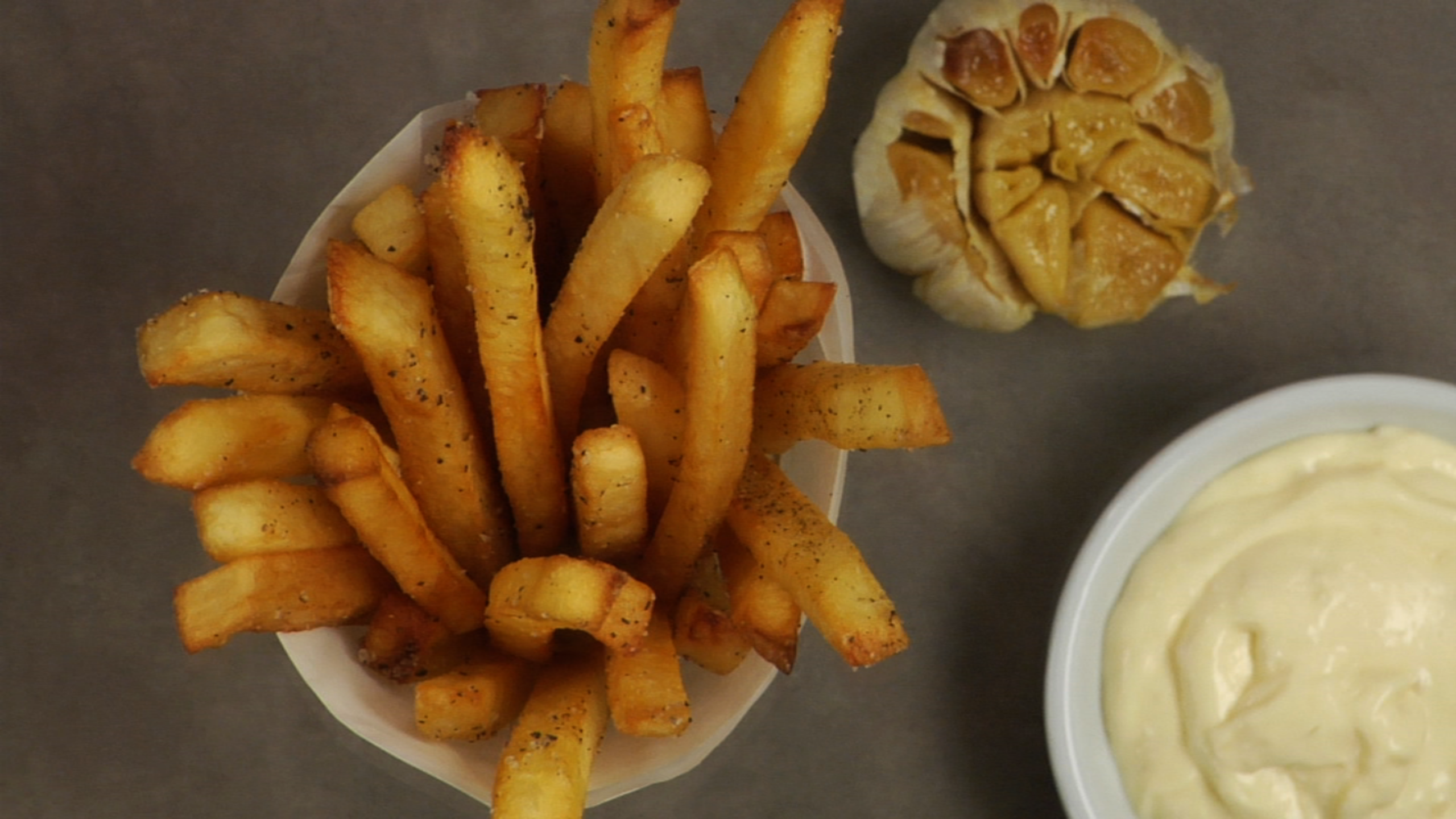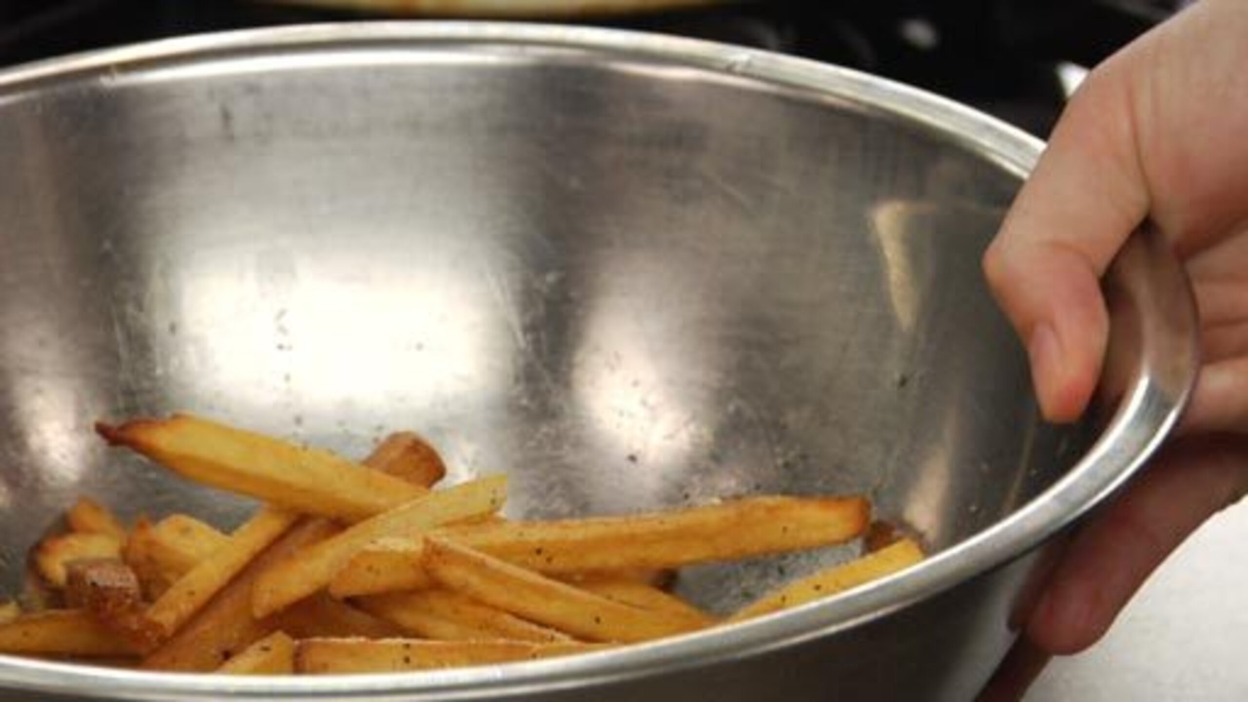 When the oil is ready, fry the potatoes for the second time. Place a handful of the potatoes onto the spider and lower into the oil. It can take anywhere from 1 1/2 to 5 minutes, depending on how crunchy you like your fries and how thick they were to begin with. Once crisp and golden, remove them from the oil and place them directly into the bowl. It’s important to season the potatoes while they’re nice and hot to ensure the seasoning sticks. Then give them a toss and serve immediately while you cook the next batch.