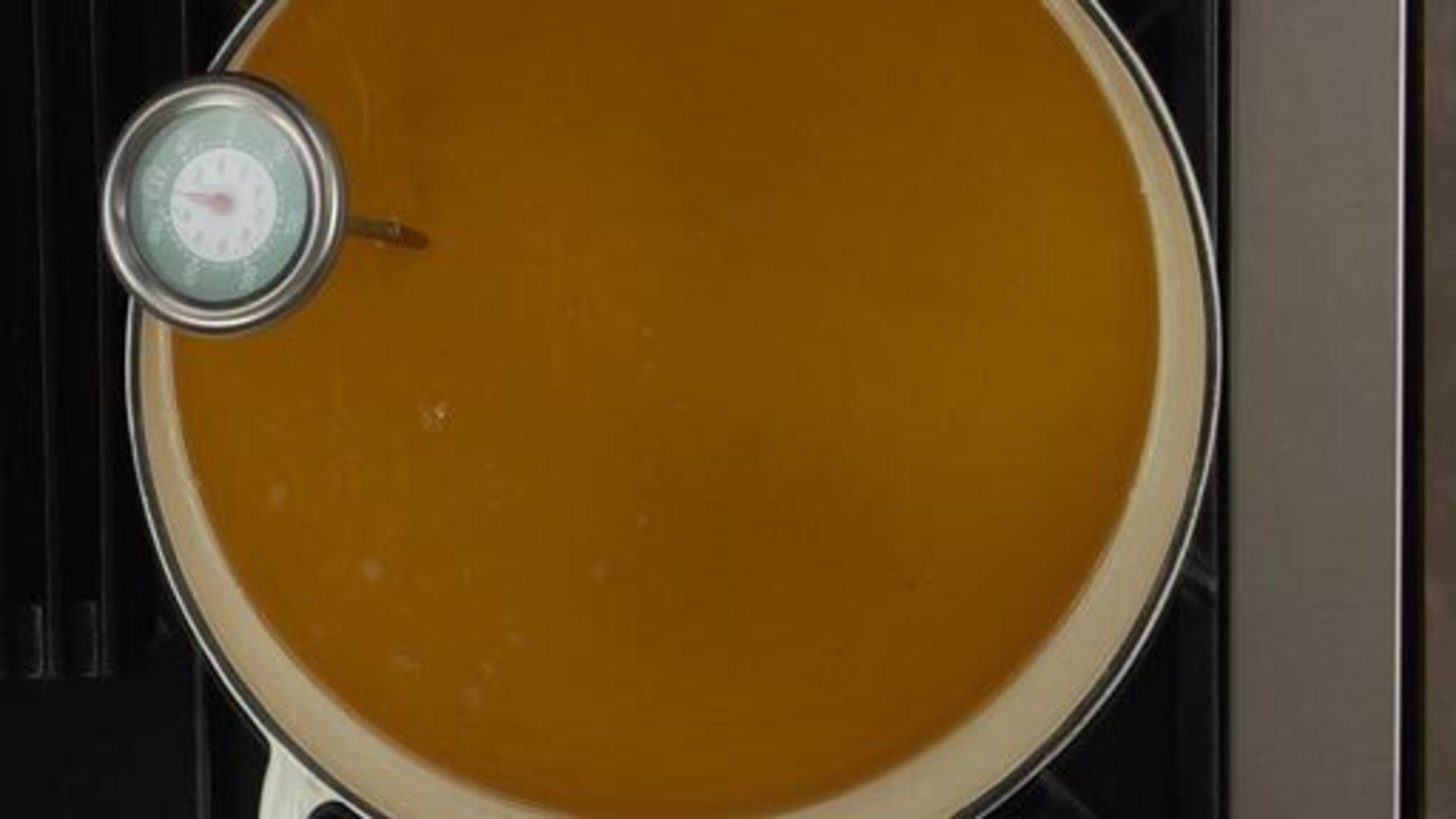 To begin, attach a thermometer to a large, heavy-bottomed pot. to ensure an accurate reading, make sure the prong does not touch the bottom of the pot.