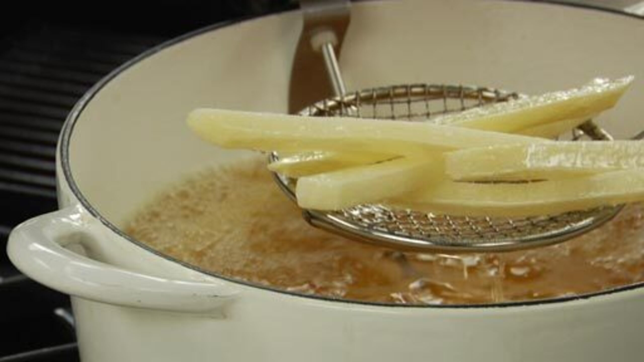 Dry a handful of potatoes with another clean kitchen cloth. The potatoes must be dry so they don’t splatter once they hit the oil. Working in small batches, place the potatoes onto the spider and gently lower them into the oil. Blanch for about 1 1/2 to 2 minutes or just until softened slightly. You might also want to use a timer so you can time each batch. This will ensure that all of the potatoes cook evenly.