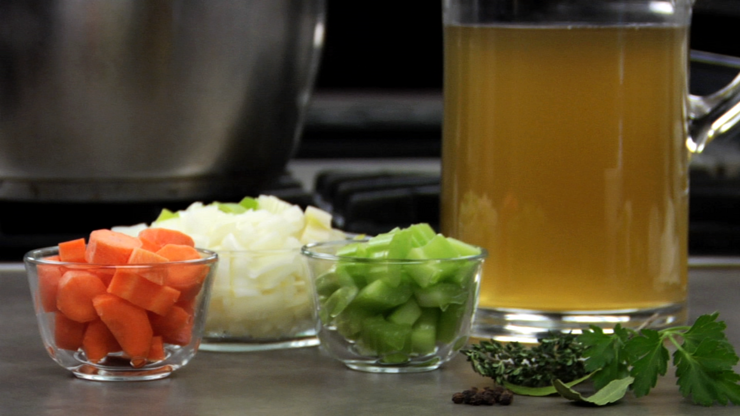 After the stock has simmered for about 30 minutes, skim one more time before adding the mirepoix.
